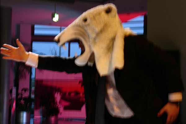 da setzt er sich einen Furcht erregenden Eisbärenkopf auf, zieht Inline-Skater