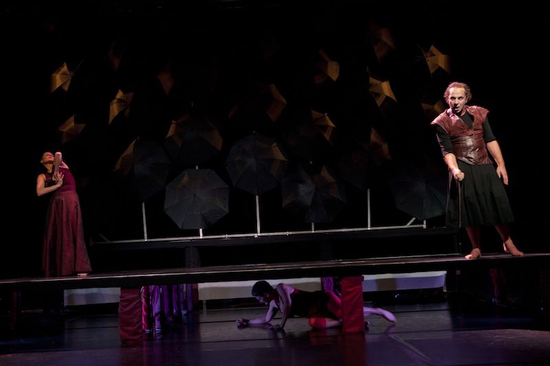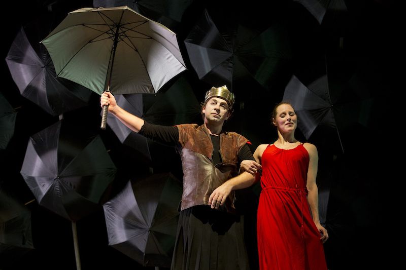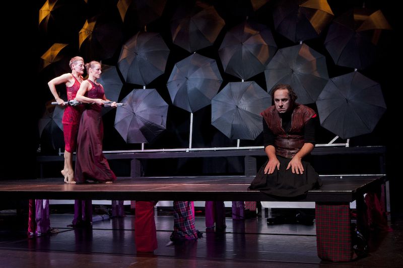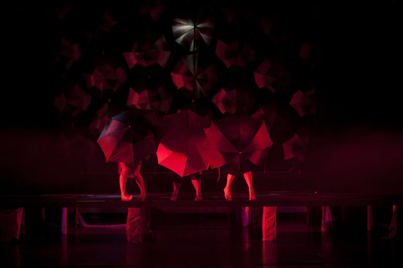 schwarze Regenschirme, die an der Decke hängen und als Bühnenrückwand dienen. Zum Schluss, wenn die Wand langsam umkippt,