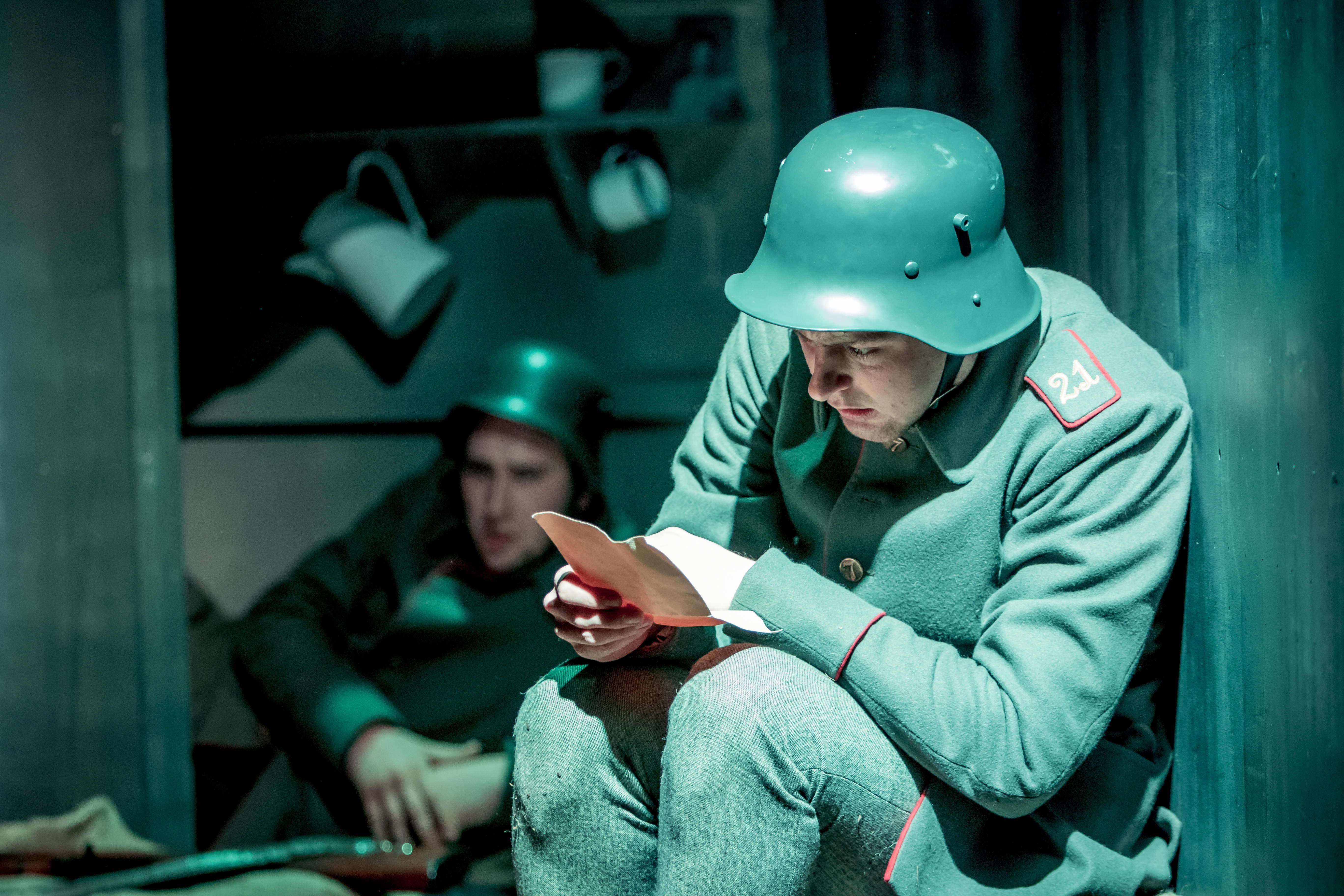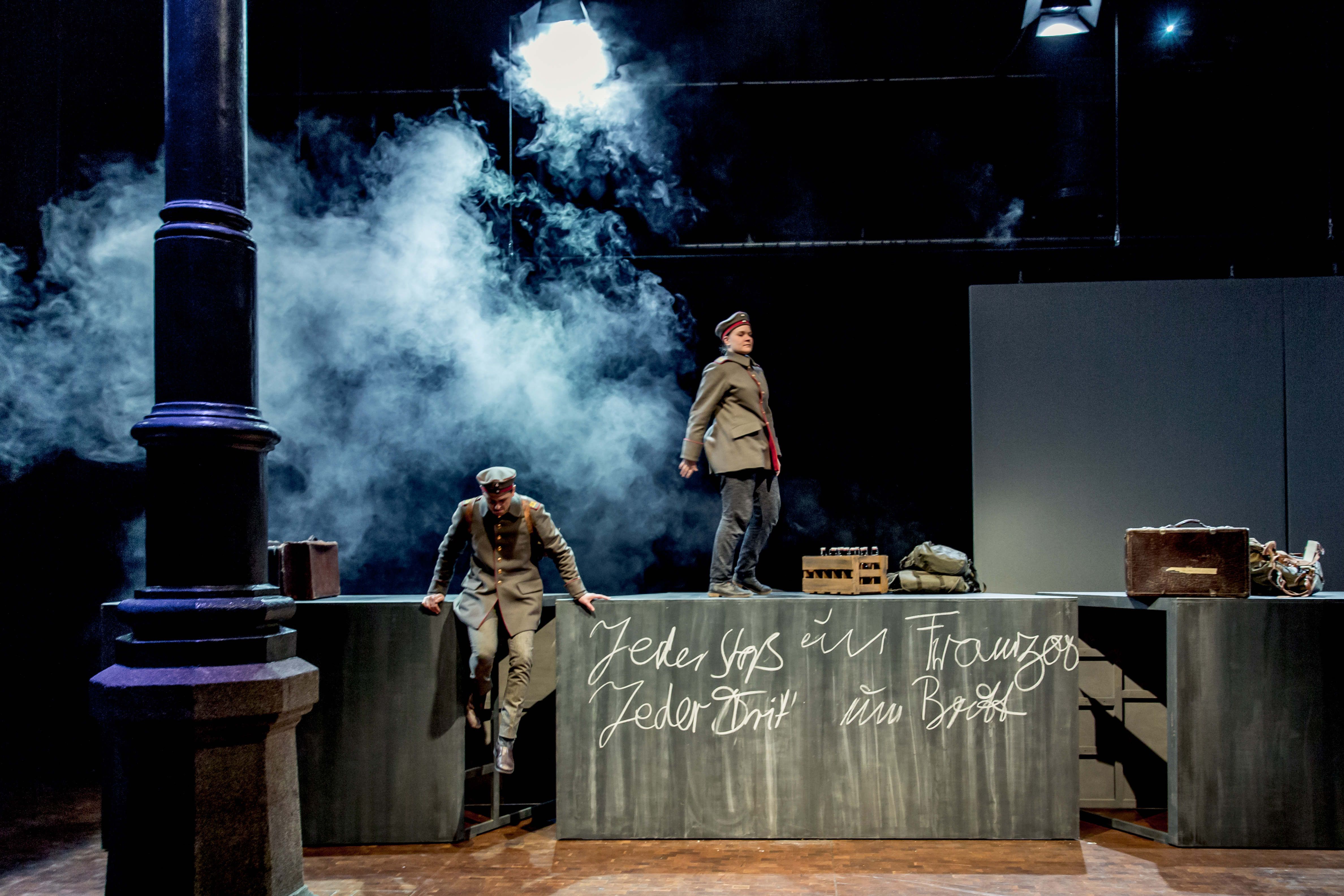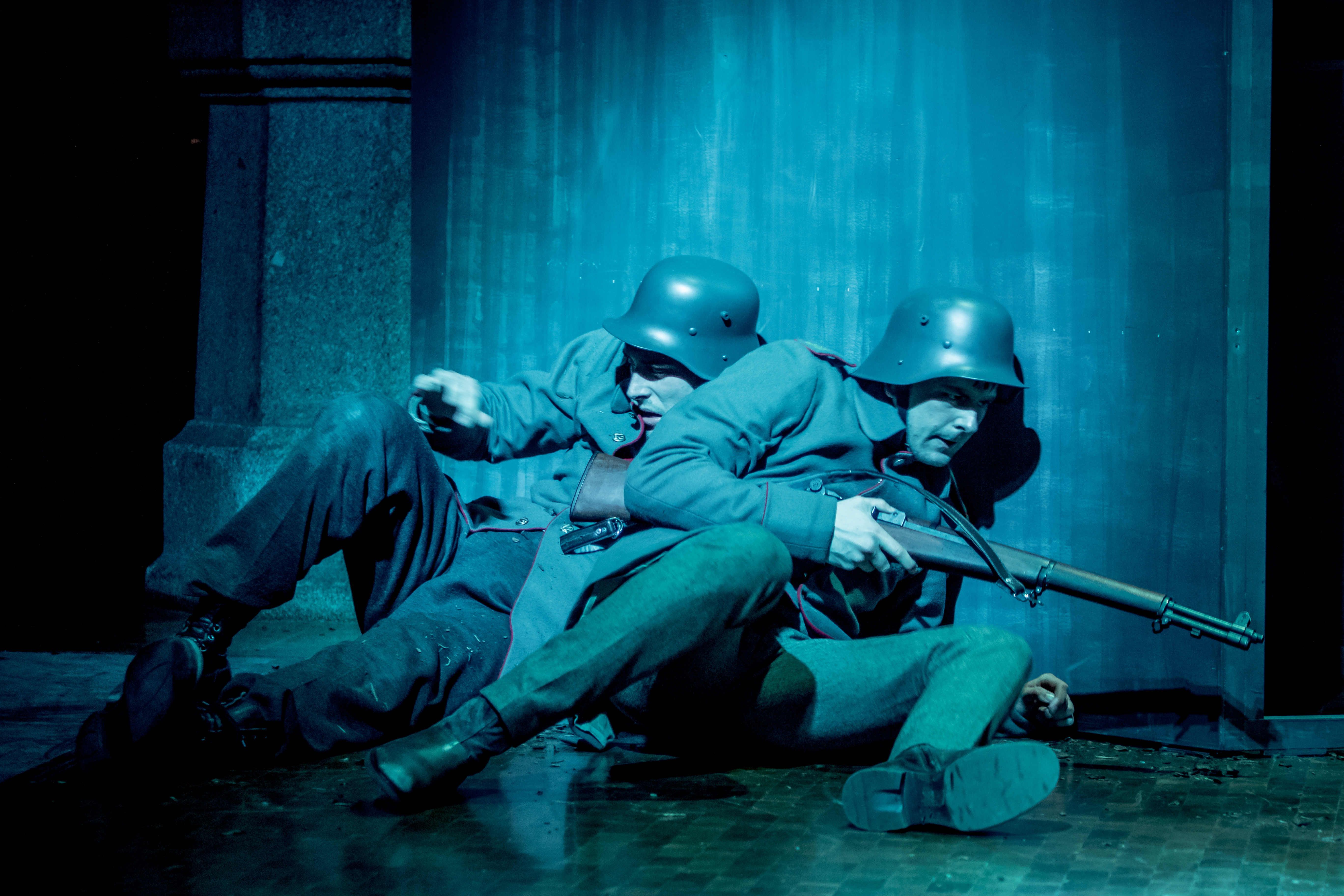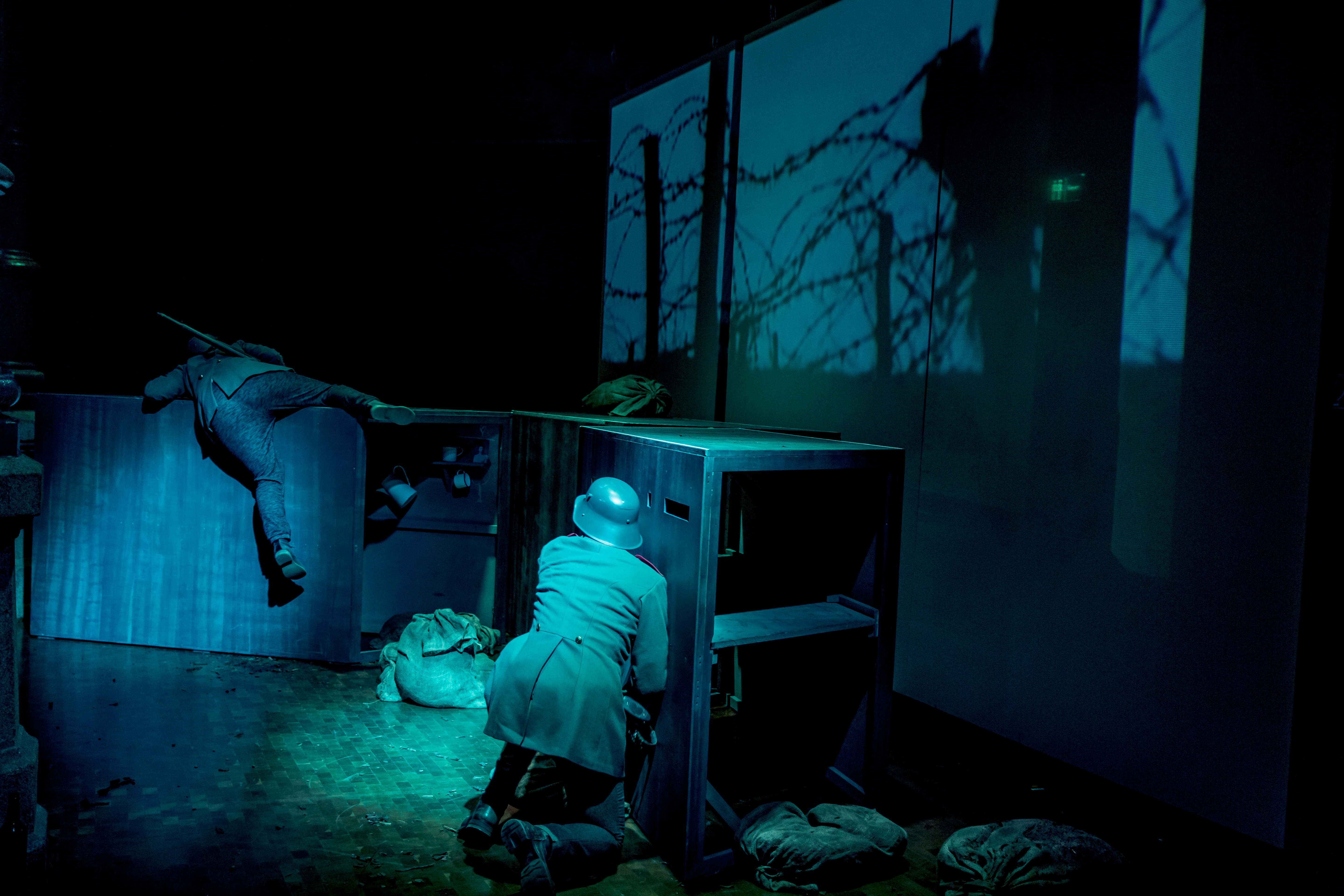 Besonders eindringlich ist der Kriegsschauplatz gestaltet: mit verschiebbaren grauen Podesten erstehen die