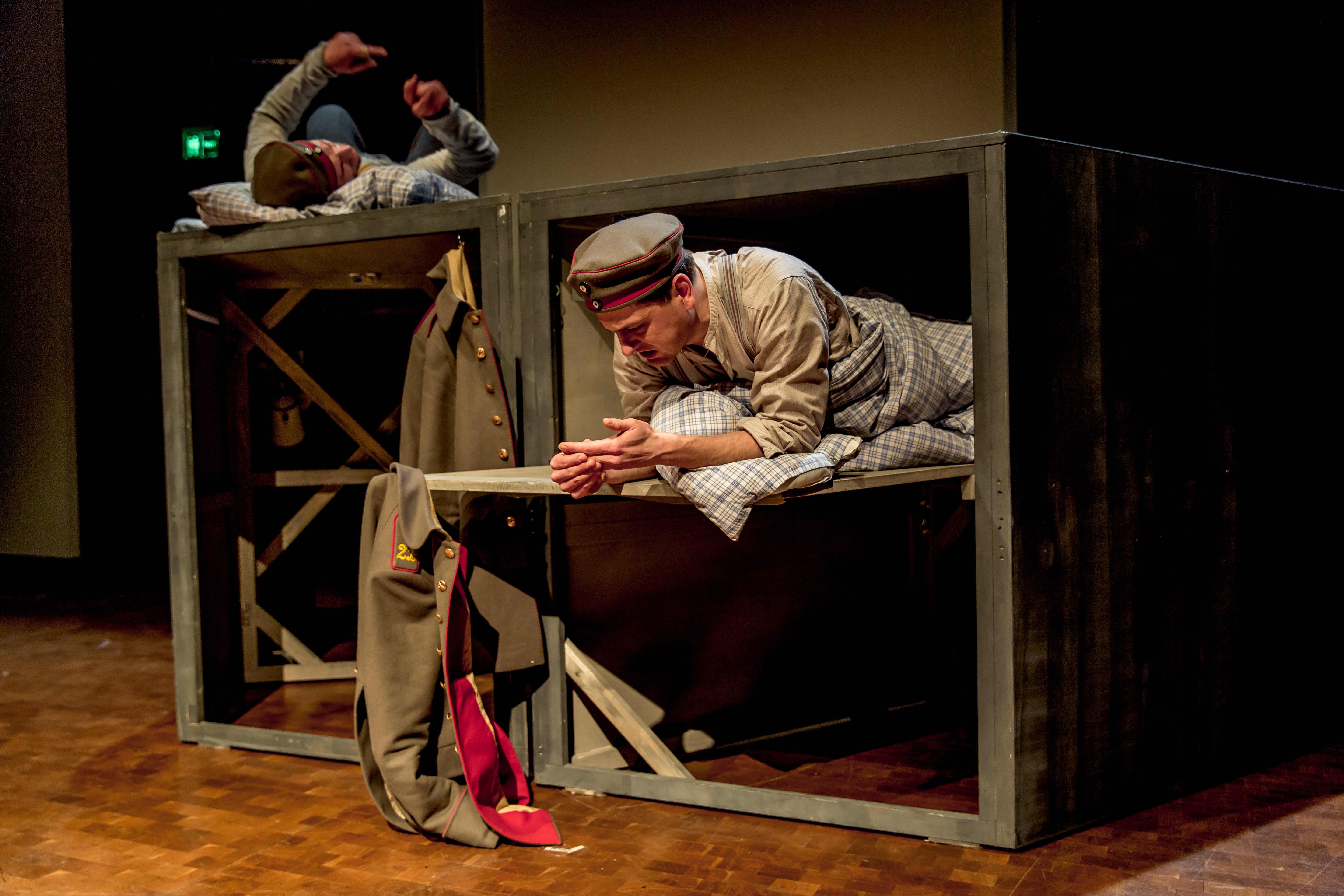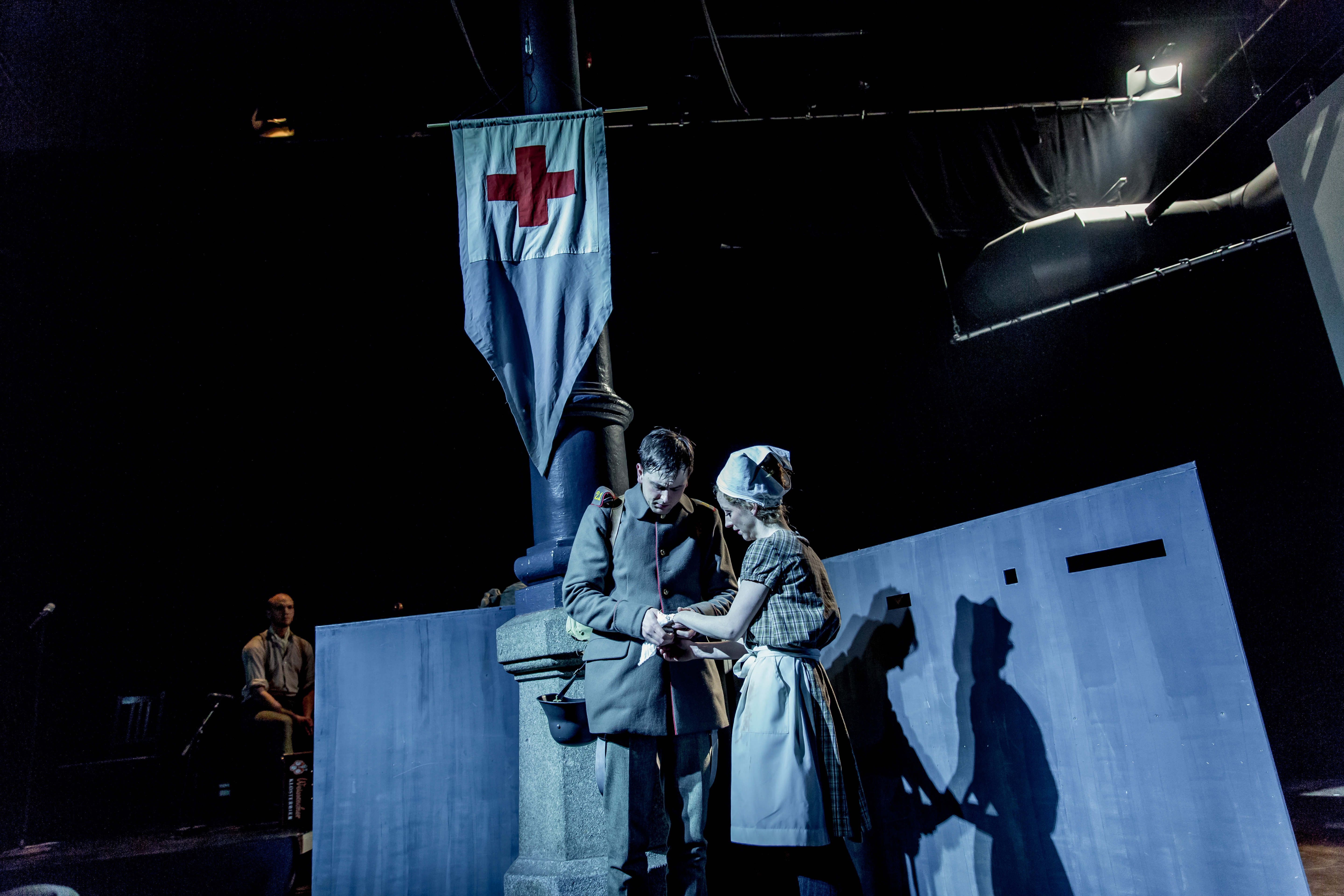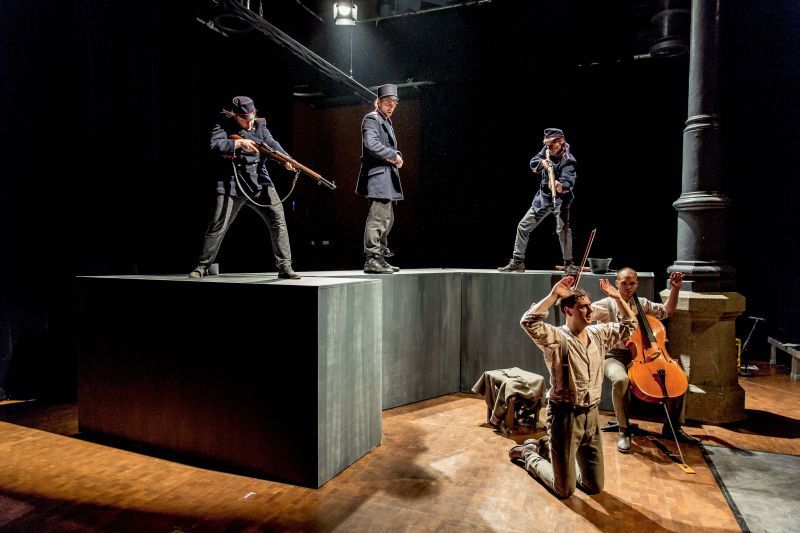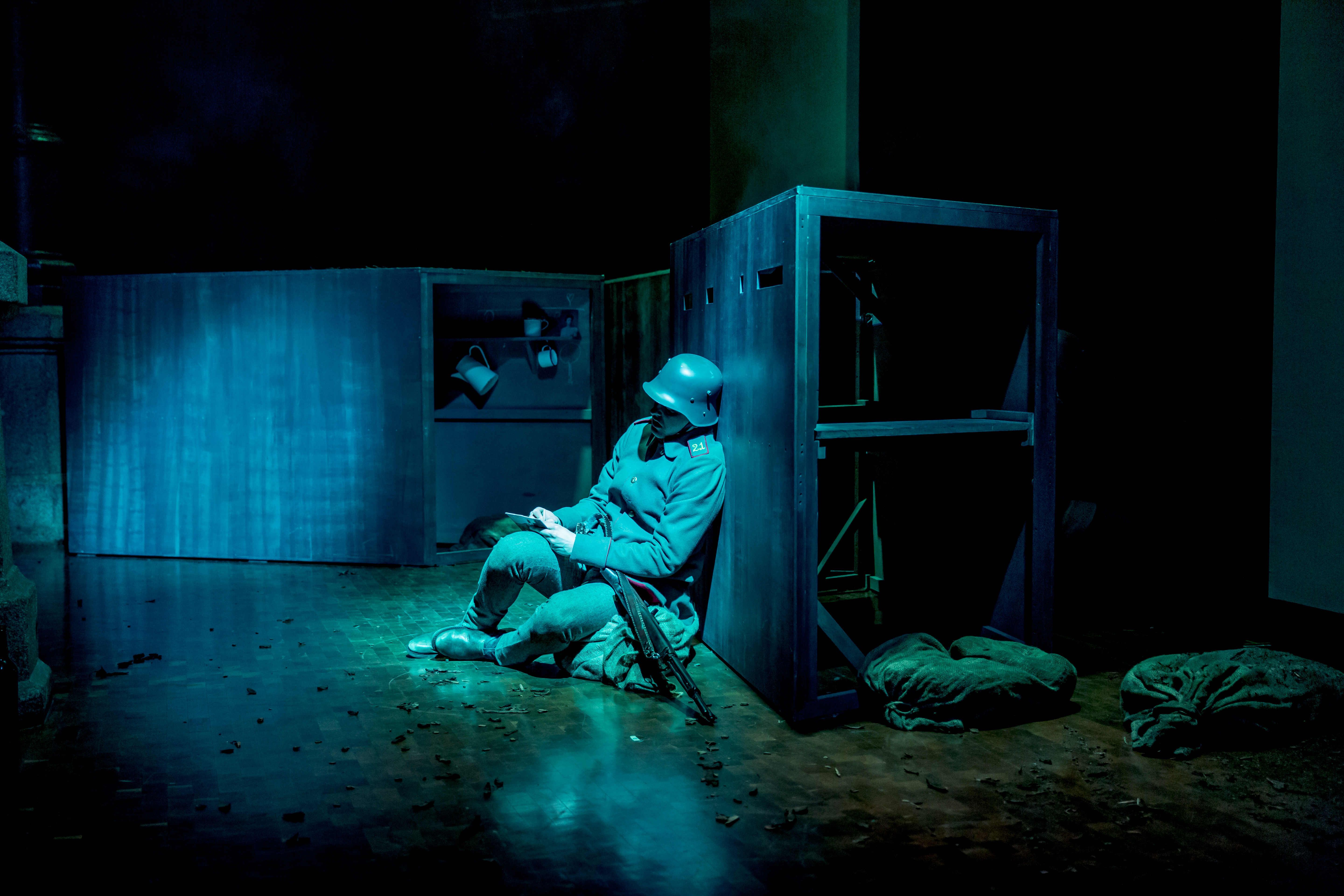 Besonders eindringlich ist der Kriegsschauplatz gestaltet: mit verschiebbaren grauen Podesten erstehen die