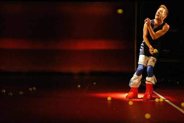 Trampolin und der Schauspieler Guido Wachter unter Beschuss von Tennisbällen.